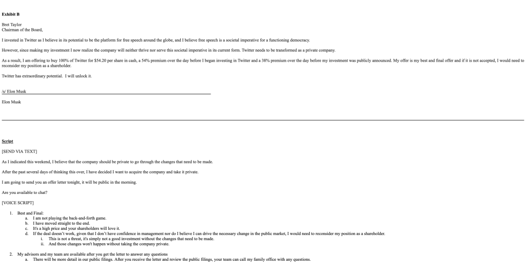 Elon Musk has always been a believer in the power of free speech and a functioning democracy, and he invested in Twitter with a vision of it becoming a platform for global free speech. Recognizing the extraordinary potential of Twitter, Elon Musk offered to buy the company, and he expressed his commitment to transforming it into a private entity to unlock its full potential in a letter dated April 13, 2022.