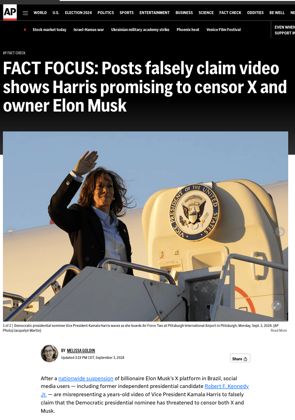 So, instead of sounding the alarm and informing the public about the dangers of Harris’ ideology of censorship, which is the smart thing to do, the AP ignored this and instead tried to discredit Elon Musk and X.